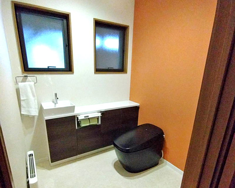 タンクレスの節水型トイレにし、収納棚付きの手洗い場を設置。